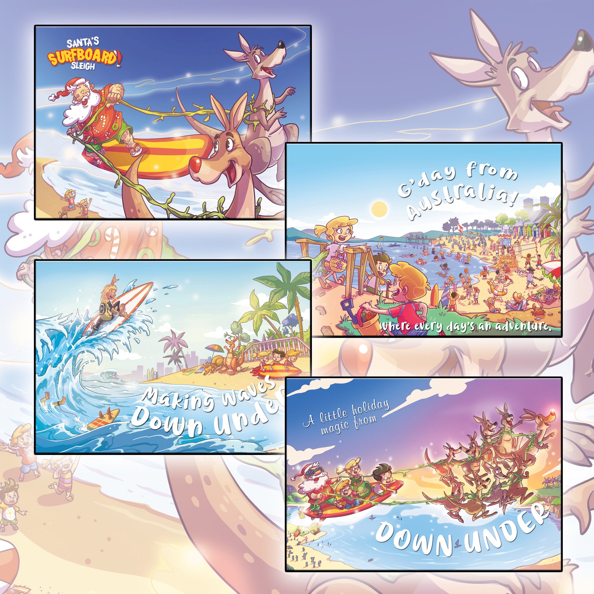 These postcards are printed on thick, high quality stock and feature artwork from Santa's Surfboard Sleigh. Each pack includes all four designs, with a clean, writable back for your message. They’re a great way to send a little Aussie sunshine around the world and share the spirit of a warm, beachy Christmas with the people you care about.